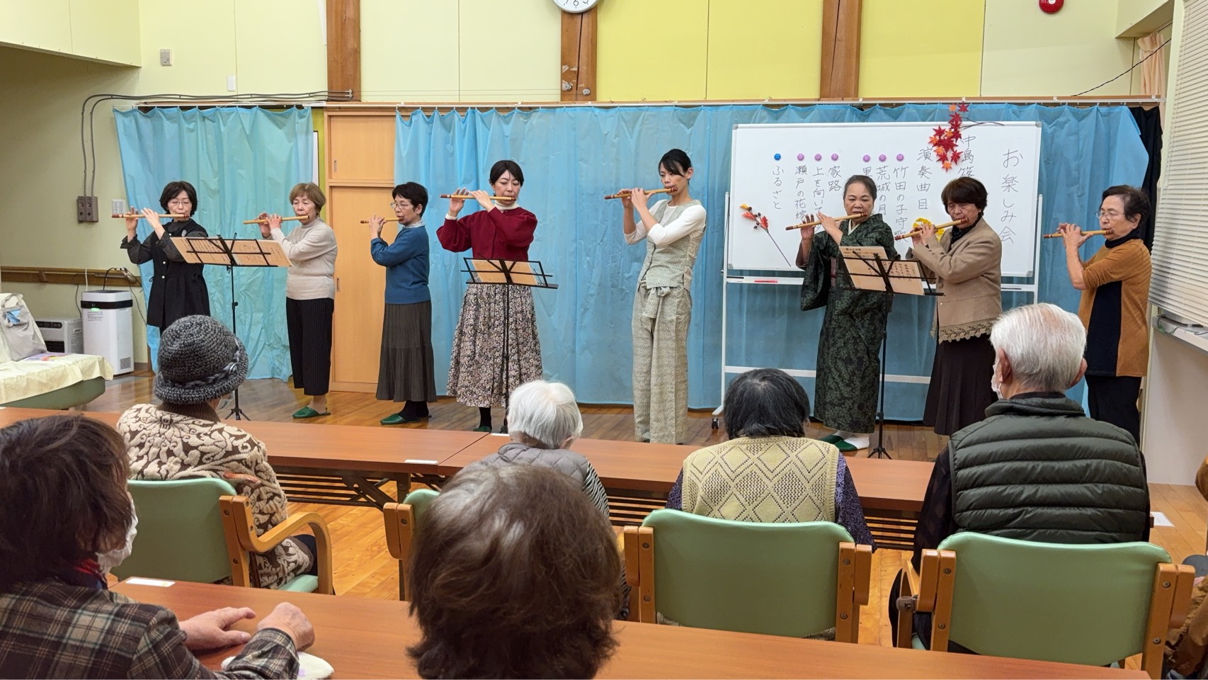 12月のお楽しみ会では篠笛の演奏会を開催しました😊 篠笛の綺麗な演奏を聴きながら、抹茶とお菓子も楽しみましたよ❕ 「抹茶もお菓子も笛の音も良かったねー」とみなさん笑顔でした👏